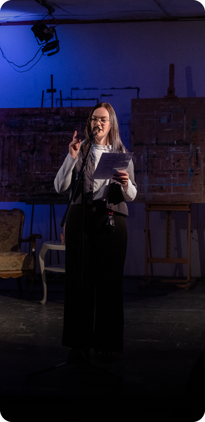 Hier gibt es keine Grenzen für Poesie. Ob Poetry Slam, Spoken Word, Gedichte oder Comedy: Alles hat seinen Platz. Wir bieten eine Bühne, auf der sich verschiedene Stimmen Gehör verschaffen können. Wer Lust hat, seine Texte mit anderen zu teilen oder einfach nur zuzuhören, ist hier genau richtig. Komm vorbei und lass dich von der Vielfalt an Worten und Ideen überraschen!